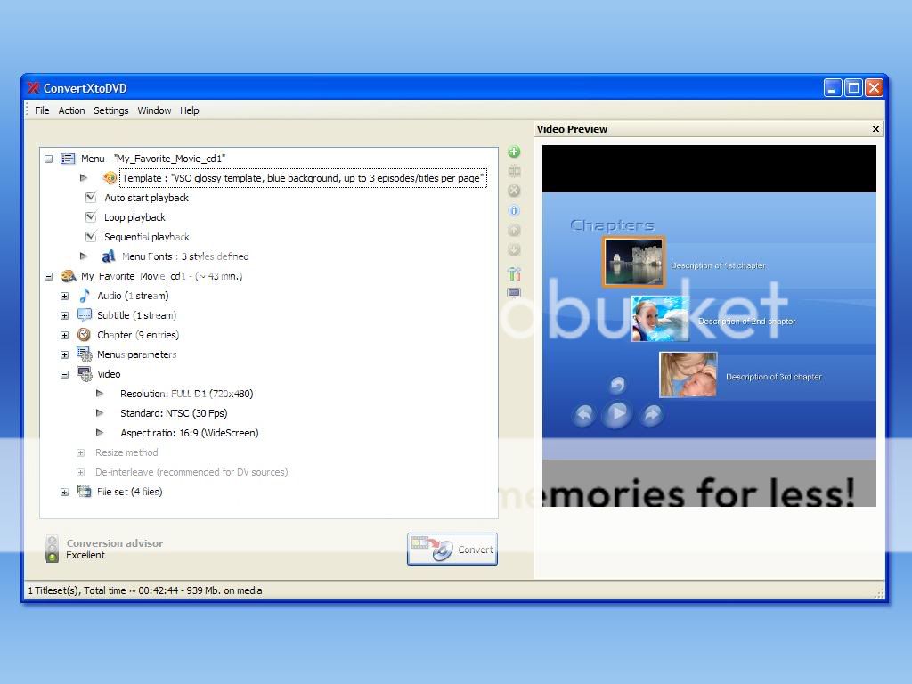 ConvertXtoDVD is a tool that converts and burns your internet movie files to DVD. Backup and transfers your movies to DVD. It is a all in one video conversion and burning application. Video formats that are supported are: avi, divx, xvid, mov, mkv, flv , mpeg1, mpeg2, mpeg-, nsv, dvr-ms, tivo, ts, ifo, vob, asf, wmv, realmedia, rm, rmvb, ogm, existing files from digital camcorders, TV/Sat, and capture cards.